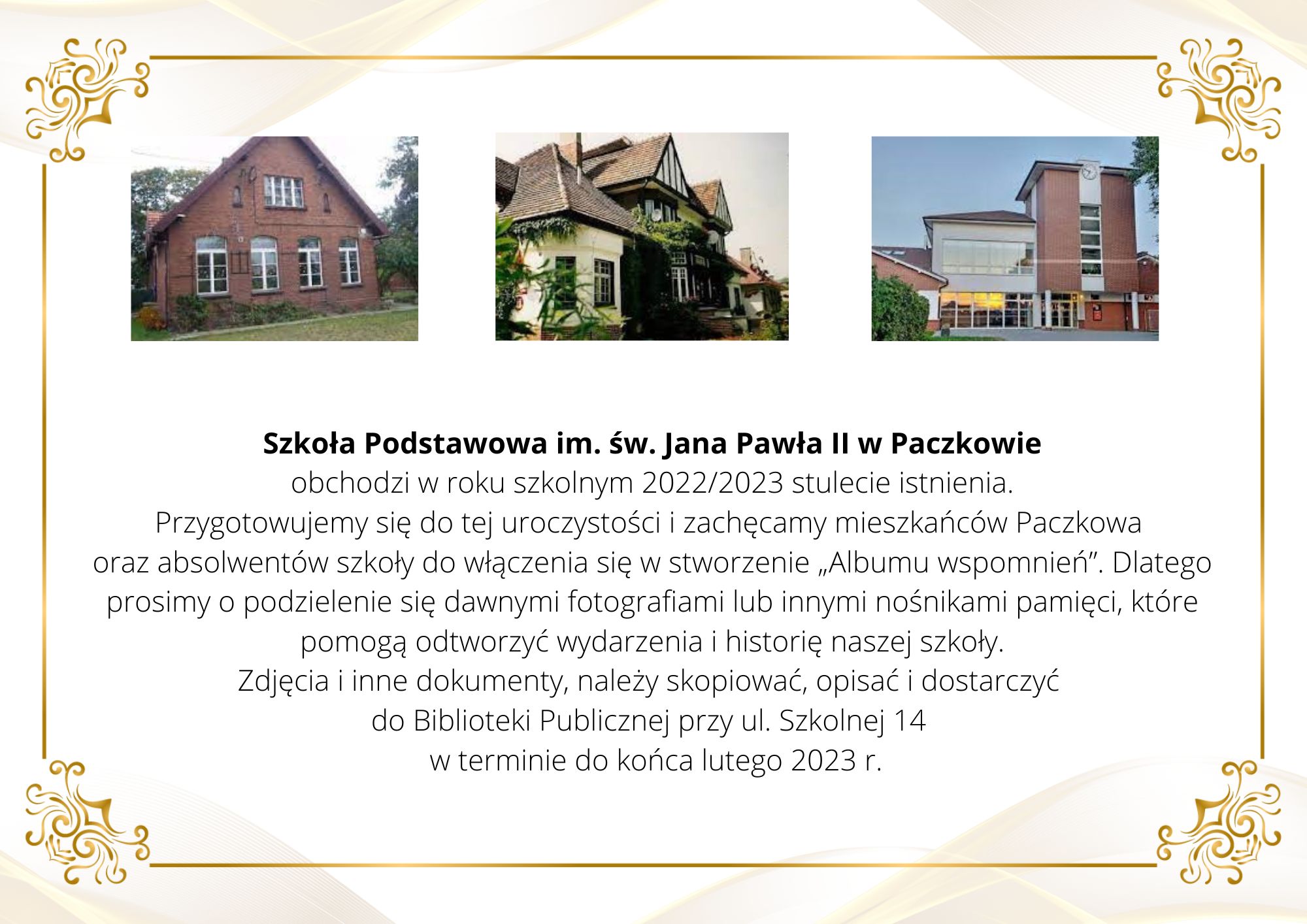 W 2023 roku społeczność szkolna obchodziła niezwykły jubileusz – 100 lat istnienia polskiej szkoły w Paczkowie. Jubileusz miał charakter całoroczny, a kulminacyjnym punktem było uroczyste świętowanie 3 czerwca 2023 roku – prawdziwe spotkanie pokoleń. Obecni byli przedstawiciele władz lokalnych, kuratorium, byli dyrektorzy, nauczyciele i absolwenci. Było wiele wzruszeń, wspomnień i dumy z rozwoju szkoły, a także symboliczne zapalenie zniczy na grobach zasłużonych pedagogów