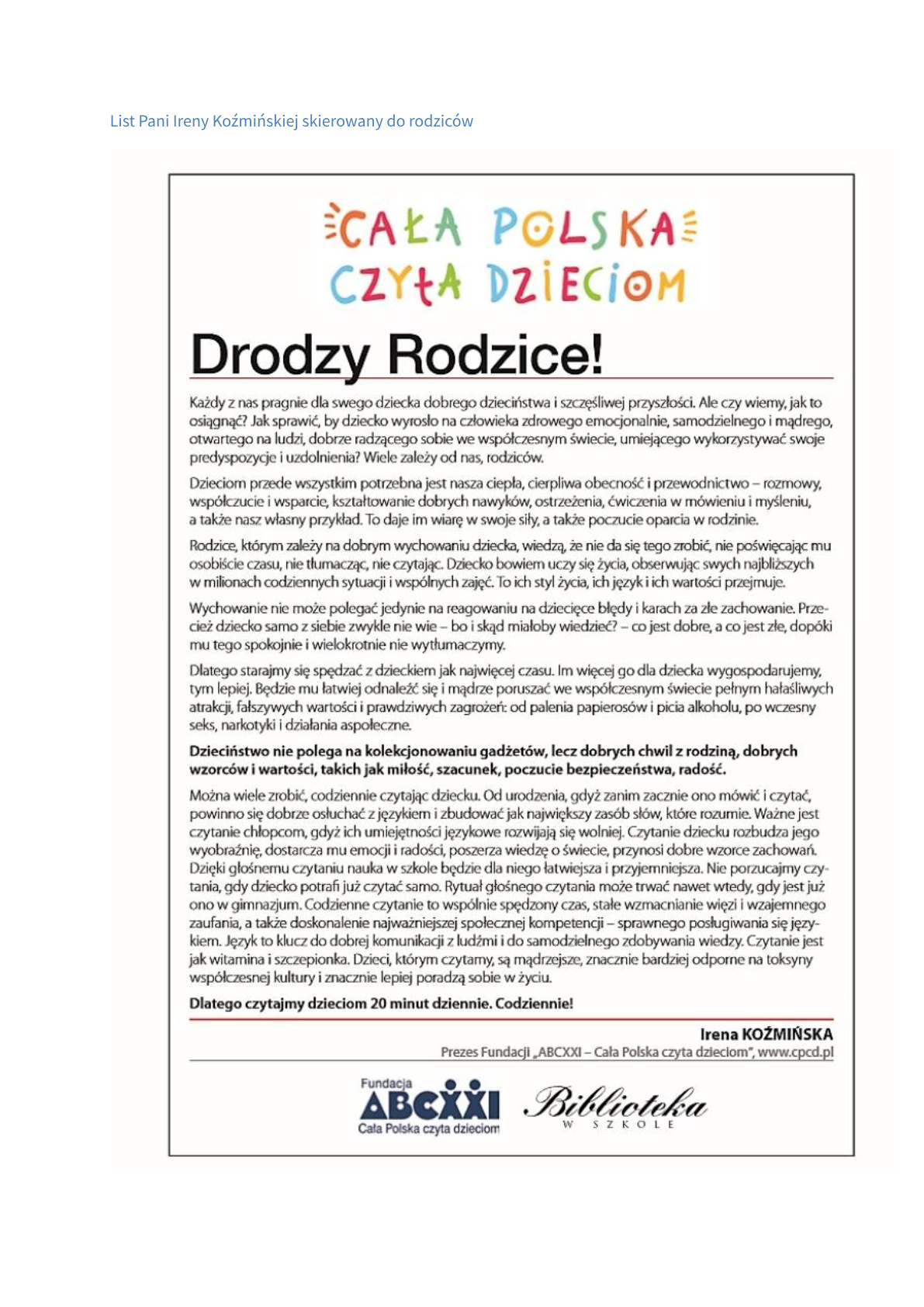 📖 List do rodziców – "Cała Polska czyta dzieciom"