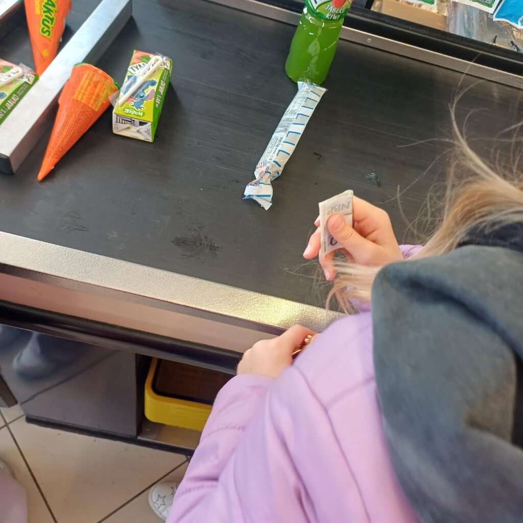 Dzieci ćwiczyły rozpoznawanie polskich nominałów, nazywały monety i banknoty oraz uczyły się, jak prawidłowo posługiwać się pieniędzmi. Następnie przeliczały odpowiednie kwoty, dodawały ceny produktów i wykonywały proste obliczenia związane z zakupami. Dzięki temu mogły przekonać się, jak wiedza zdobywana w szkole przydaje się w praktyce.