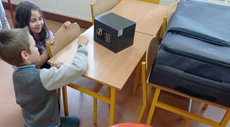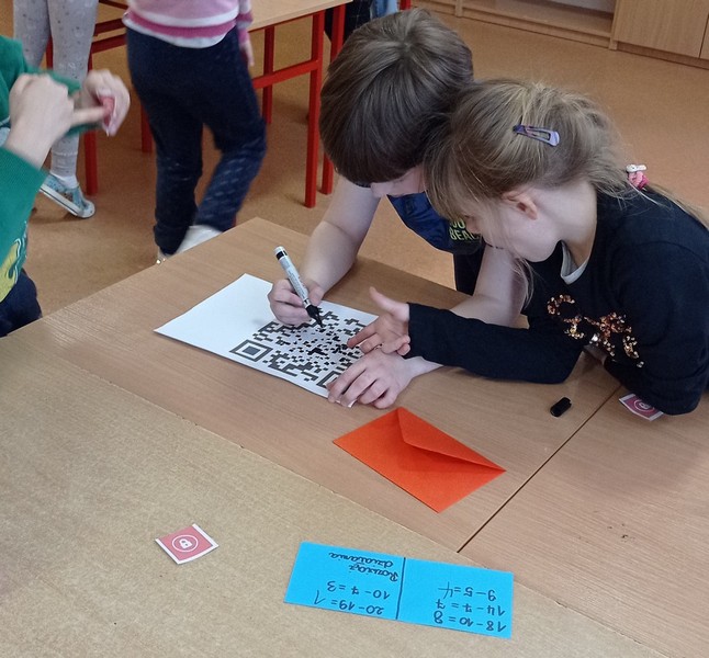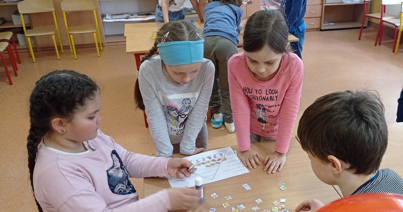 Każdy uczeń został przydzielony do stanowiska w różnych kolorach. Przy stanowisku żółtym uczniowie musieli odkodować hasło (“Zdrowe jedzenie to moje paliwo!”) i głośno je wykrzyczeć. Stanowisko zielone sprawdzało wiedzę ze znajomości piramidy żywienia- uczniowie mieli za zadanie ją uzupełnić. Stanowisko czerwone było matematyczne- dzieci musiały rozwiązać zadania z dodawania i odejmowania, a potem na podstawie wyników uzupełnić kod QR. Przy ostatnim stanowisku zadaniem było ułożenie puzzli i odkrycie hasła. Kiedy wszystkie drużyny poprawnie rozwiązały swoje zagadki, każda grupa dostała balony, w których były ukryte dalsze wskazówki- w ruch poszły kody do sejfu i walizki, telefon do odczytania kodu QR i długopis z podświetleniem UV. Sejf krył przyrządy do krojenia i talerzyki, walizka- owoce, kod- zdjęcie sałatki owocowej, a ukryte hasło brzmiało- SMACZNEGO! Uczniowie od razu domyślili się, że nagrodą jest wspólne wykonanie sałatki owocowej.