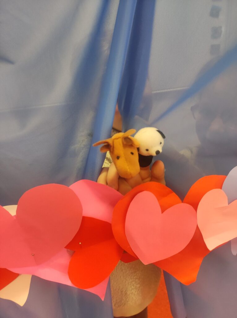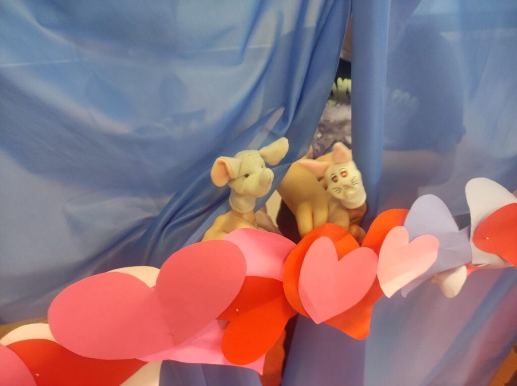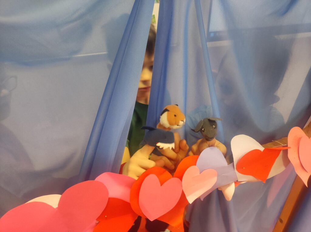Młodsi uczniowie, z pomocą pacynek, odgrywali krótkie scenki grzecznościowe, ucząc się uprzejmych zwrotów w praktyce.