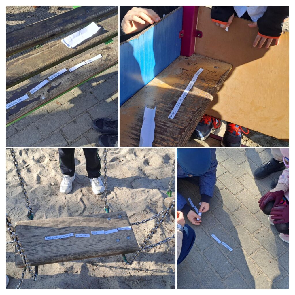 Po pysznym śniadaniu przyszedł czas na kolejne wyzwanie – poszukiwania pisanek, które zgubił Zając Kiciuś. Aby je odnaleźć, wyruszyliśmy na pełną emocji grę terenową. Czekało na nas aż 8 różnorodnych zadań! Było dużo ruchu, liczenie, rysowanie ogromnych pisanek, zagadki oraz zgadywanki. Każdy mógł wykazać się sprytem, kreatywnością i współpracą.